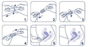 With your free hand, open the folds of skin around the vagina, position the rounded end of the tampon at the vaginal opening. Push the tampon into the vagina using your index finger. Remember that the vagina slopes backwards, so push the tampon towards the small of your back. If you can still feel the tampon, then it may not be inserted correctly; using your index finger push the tampon a little further into the vagina. When correctly positioned you will not be able to feel the tampon. Ensure the cord is hanging outside your body ready for removal. Don’t worries the tampon cannot get lost inside you, it has nowhere to go! Now wash your hands again.